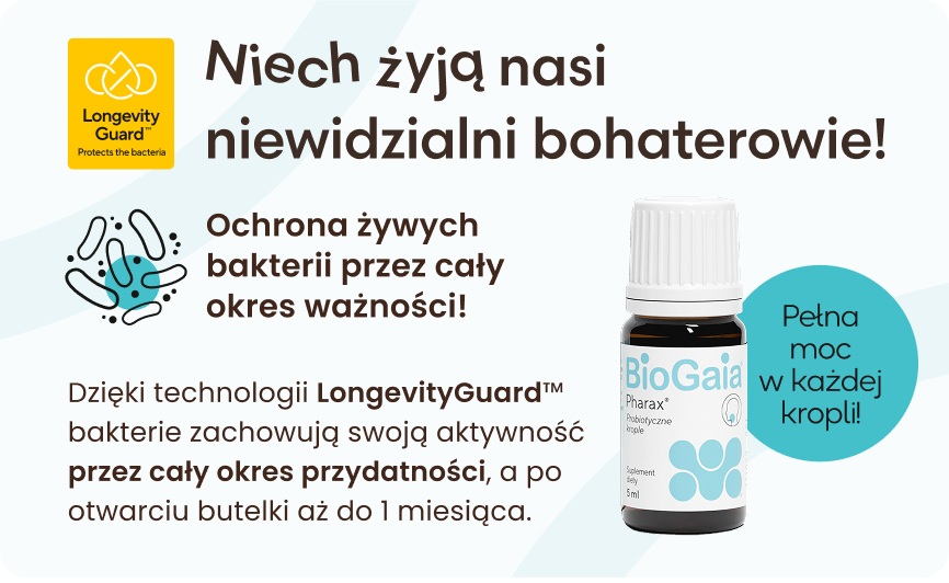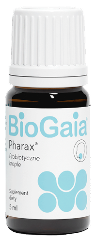 BioGaia Pharax to probiotyczne krople doustne zawierające opatentowane szczepy bakterii kwasu mlekowego:- Limosilactobacillus reuteri DSM 17938
