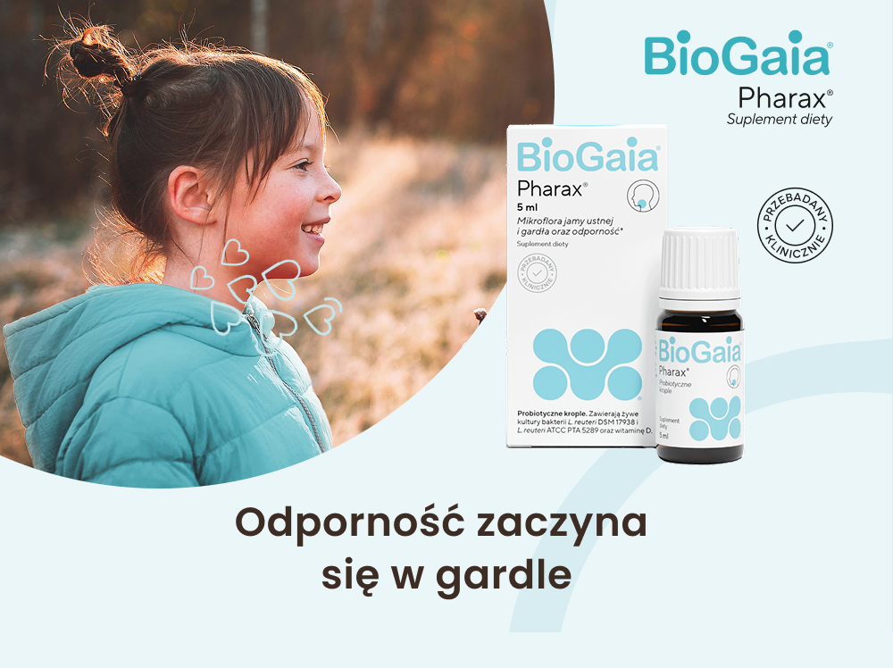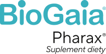 BioGaia Pharax to suplement diety, uzupełniający mikroflorę bakteryjną przewodu pokarmowego, w tym jamy ustnej i gardła. Produkt zawiera opatentowane szczepy bakterii kwasu mlekowego Limosilactobacillus reuteri: DSM 17938 i ATCC PTA 5289 oraz 10 µg witaminy D.