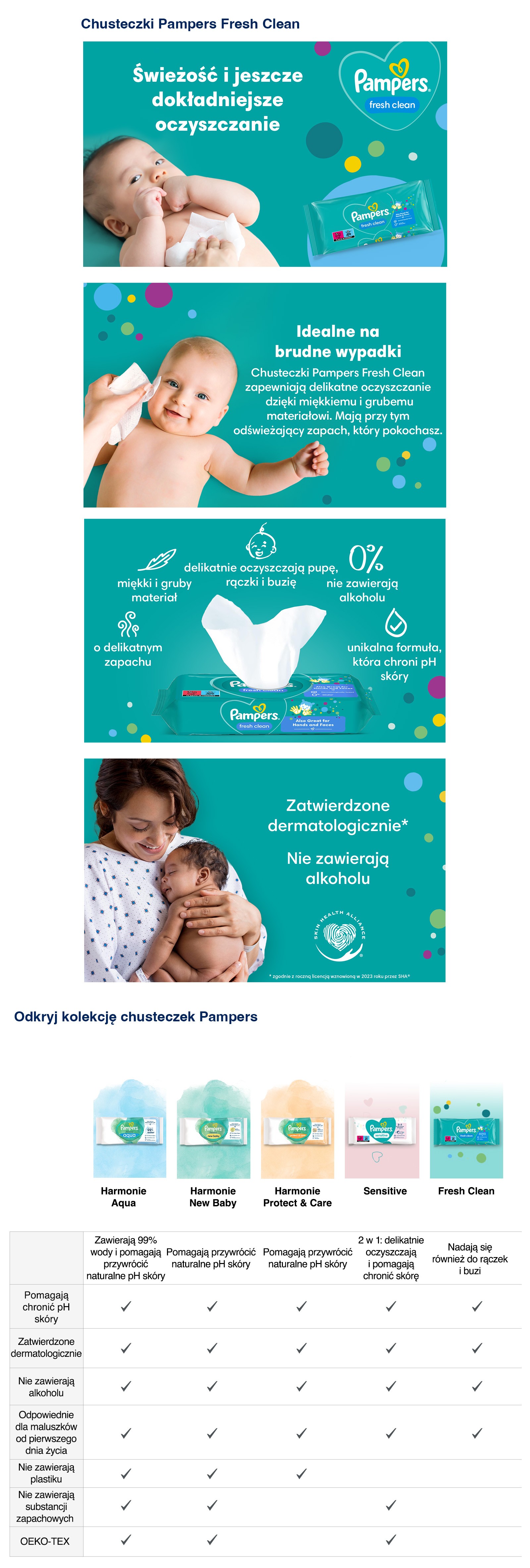 Skóra Twojego dziecka jest bardzo delikatna i zasługuje na łagodne oczyszczanie. Chusteczki Pampers Fresh & Clean zapewniają delikatne oczyszczanie dzięki miękkiemu i grubemu materiałowi. Mają przy tym odświeżający zapach, który uwielbiasz. Enzymy znajdujące się w siusiu i kupce zmieniają pH skóry, zwiększając ryzyko wystąpienia podrażnień i wysypki. Wszystkie chusteczki Pampers zawierają unikalną formułę, która chroni naturalne pH skóry lepiej niż bawełniane płatki kosmetyczne nasączone wodą, oczyszczając delikatną skórę Twojego dziecka i chroniąc ją przed podrażnieniami. Chusteczki Pampers Fresh & Clean zostały zatwierdzone przez dermatologów z organizacji Skin Health Alliance. Ponieważ nawilżane chusteczki Pampers Fresh & Clean zostały zaprojektowane z myślą o delikatnej skórze dziecka, nie zawierają alkoholu ani barwników.