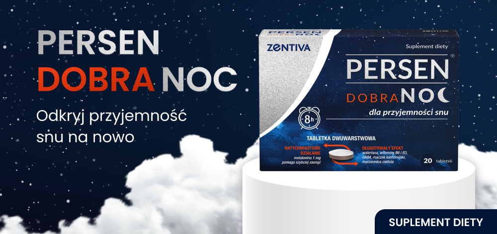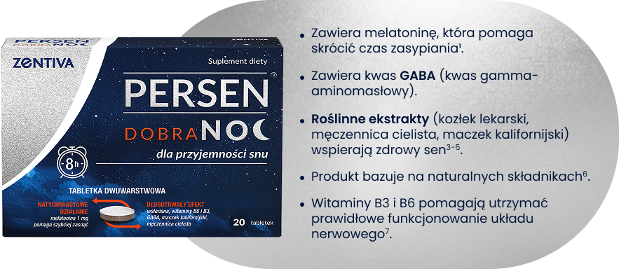 Persen Dobranoc to suplement diety przeznaczony dla osób dorosłych, które mają trudności z zasypianiem lub często wybudzają się w nocy.