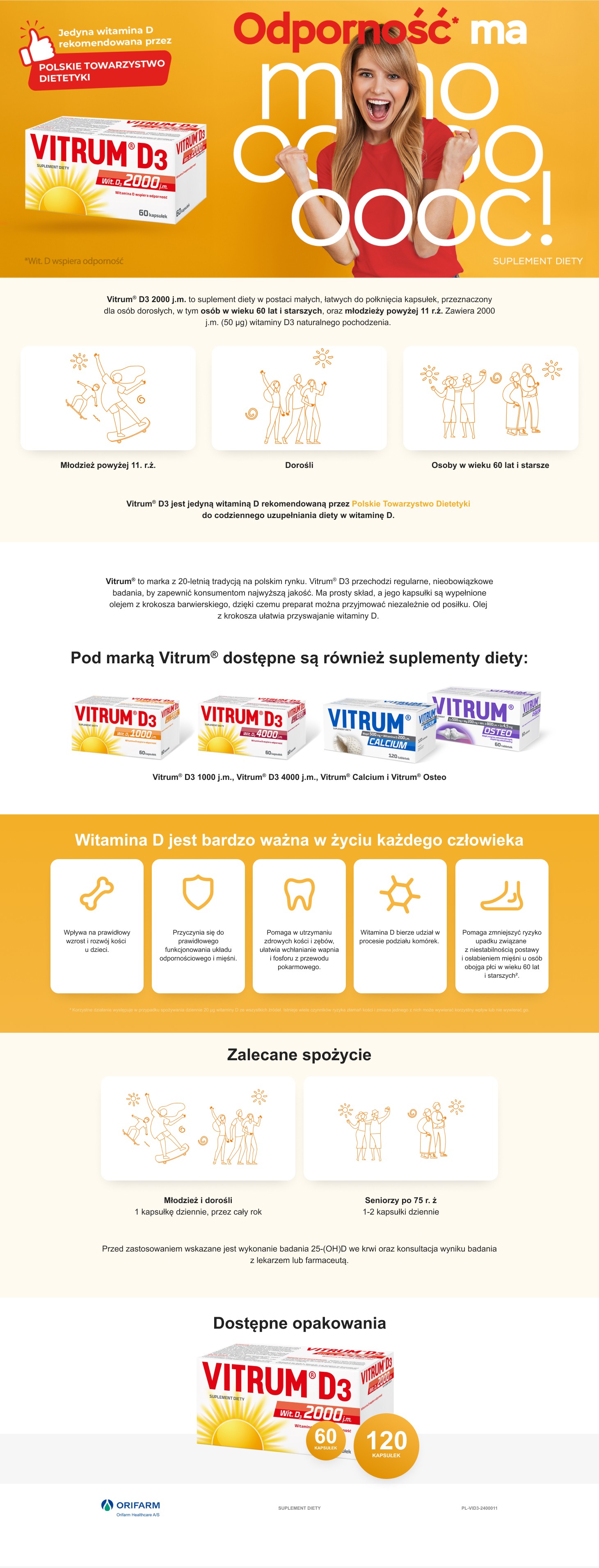Vitrum® D3 2000 to suplement diety w postaci małych, łatwych do połknięcia kapsułek, przeznaczony dla osób dorosłych, w tym osób w wieku 60 lat i starszych oraz młodzieży powyżej 11 r.ż.* Zawiera 2000 j.m. (50 µg) witaminy D3 naturalnego pochodzenia.